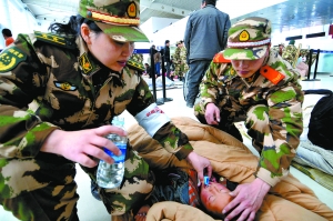 只要有傷員,羅愛華和戰(zhàn)友就用肩扛、用手抬,將傷者抬進大廳輸液、包扎……等待專機到來。13時50分,一名重傷女孩被醫(yī)療隊從車上接到候機大廳。羅愛華看到女孩因缺水嘴唇干裂、臉發(fā)青。她立即拿來礦泉水,一口一口喂到女孩嘴里?赡苁翘L時間沒喝水,女孩一口氣連喝十幾口。喝了近半瓶水后,女孩臉色開始好轉(zhuǎn),并用感激的眼神打量這位阿姨。這時,接傷員的專機到達,女孩被抬上飛機。