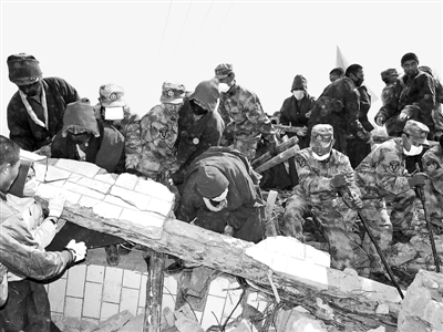 玉樹民族師范學(xué)校房屋在這次地震中全部倒塌,盡管已過去了50多個小時,但記者在這里看到,蘭州軍區(qū)某工兵團官兵們?nèi)栽诓捎蒙綔y儀進行搜救。整體坍塌的宿舍樓堆積成小山一樣的廢墟,鋼筋交錯,瓦礫遍地,破爛的書本、衣物等散落其間。在某集團軍參謀長許振華現(xiàn)場指揮下,官兵們小心翼翼地搬開瓦礫雜物,爾后用液壓泵頂起橫梁,再一件件抽出被壓著的床架、木板、棉絮。一撥官兵累了,又一撥官兵馬上接替上去。大家的臉上、身上沾滿了灰塵,汗珠混合著臉上的泥土一滴滴滑落。一直在現(xiàn)場指揮營救工作的該團政委楊新民說:“生命至上,救人第一。只要有一線希望,我們就會盡百分之百的努力!”