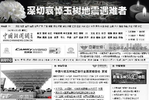 中新社廣州4月21日電 (張乾鑠)21日凌晨零時(shí)起,中國最具影響力的新聞網(wǎng)站人民網(wǎng)、新華網(wǎng)、中國新聞網(wǎng)等各大網(wǎng)站主頁頁面全部變?yōu)榛疑,這是中國互聯(lián)網(wǎng)界的統(tǒng)一行動(dòng):為青海玉樹地震中遇難的同胞志哀,為玉樹人民祈福。