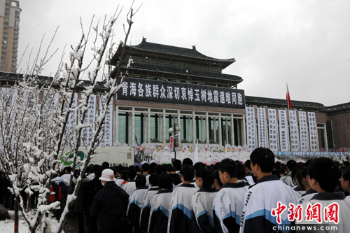 按照青海省政府20日公告,今日上午10時(shí)整起,青海全省人民默哀三分鐘,屆時(shí)汽車、火車、輪船鳴笛,防空警報(bào)鳴響。玉樹的悼念活動(dòng)在結(jié)古鎮(zhèn)舉行,其它地方舉辦規(guī)模適中的集中悼念儀式。