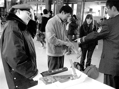 記者21日獲悉,為確保上海世博會安全,北京鐵路警方根據(jù)鐵道部、公安部日前聯(lián)合發(fā)出的通知,從即日起至11月15日,將對登車旅客隨身攜帶的物品以及通過鐵路托運(yùn)的行包進(jìn)行特別安檢。據(jù)了解,旅客不得隨身攜帶上車的物品除了管制刀具以外,餐刀、大型水果刀、剪刀、錘子等利器和鈍器也在禁帶之列。