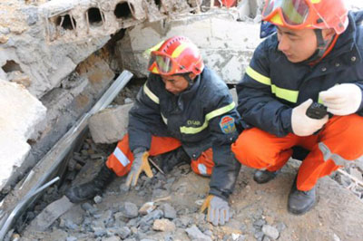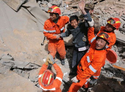 國家救援隊在到達玉樹機場后,救援隊員火速前往受災(zāi)最重的玉樹縣城結(jié)古鎮(zhèn)。全體救援隊員挑燈夜戰(zhàn),齊心協(xié)力營救出2名幸存者。雖初戰(zhàn)告捷,但救援隊員不敢絲毫松懈,因為廢墟還有更多生命等待我們。只要有一線希望,我們就會盡百倍努力,“不拋棄,不放棄”。