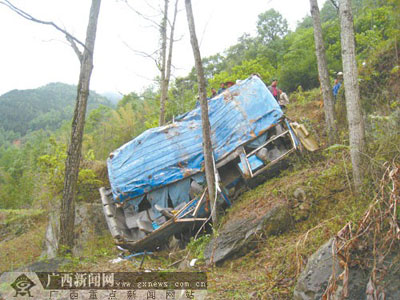 東蘭訊 4月22日上午9時(shí)許,一輛由大化瑤族自治縣七百弄鄉(xiāng)開往河池市的客運(yùn)中巴車,在途經(jīng)東蘭縣花香鄉(xiāng)干來村時(shí)突發(fā)機(jī)械故障,導(dǎo)致車輛滾下90米長陡坡(垂直高度40米)。事故造成車上7名乘客先后死亡,35人不同程度受傷。