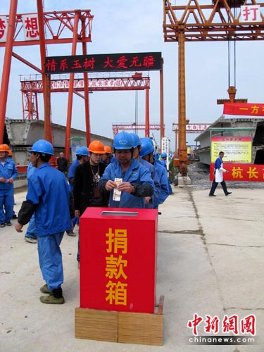 據(jù)杭州市高速公路管理局局長(zhǎng)趙益民介紹,青海玉樹地震災(zāi)情發(fā)生后,杭長(zhǎng)高速公路杭州段的建設(shè)者們,迅速自發(fā)地開展捐款活動(dòng)。據(jù)悉,昨天,杭長(zhǎng)高速共有10個(gè)施工現(xiàn)場(chǎng)舉行了“心系玉樹獻(xiàn)愛心”的捐款活動(dòng),近千名民工參加。