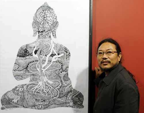 很晚了,我們才坐到飯桌旁,吾要這些天為悼念遇難同胞吃素,不事煙酒,只是溫和地說(shuō)話。他說(shuō)世人對(duì)佛的理解有偏頗,以為佛無(wú)所不能、護(hù)佑眾生,而他認(rèn)為佛的精義在于教人向善、慈悲、寬容。畫展陳列作品的主角是佛陀,是圣山,圣水,圣靈,這些不是神,是心,是偉大的自然之子——人的本身,是人類尊重生命、善待眾生、敬畏自然、愛(ài)護(hù)環(huán)境的藝術(shù)再現(xiàn)和哲理升華。
