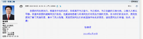 25日下午4時(shí)55分,紅網(wǎng)網(wǎng)友張春賢在紅網(wǎng)論壇發(fā)帖“告別三湘”。這位自稱“比湖南人還湖南人”的湖南人,正式作別生活了四年半的湖南。
