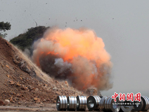 中新網(wǎng)九江4月28日電(胡國林 李濤淵)“一、二、三”,隨著一聲令下,4月27日中午,在江西九江都昌縣磯山湖附近一偏僻的時子山腳下,立即出現(xiàn)一個巨大的“火球”,原來,這里正在實(shí)施銷毀日軍侵華時期遺留下來的炮彈。