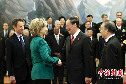 中新網(wǎng)北京5月24日電(記者 張蔚然)第二輪中美戰(zhàn)略與經(jīng)濟(jì)對(duì)話開幕式今天上午9時(shí)許在人民大會(huì)堂舉行。中國(guó)國(guó)務(wù)院副總理王岐山、國(guó)務(wù)委員戴秉國(guó)、美國(guó)國(guó)務(wù)卿克林頓、財(cái)政部長(zhǎng)蓋特納出席。