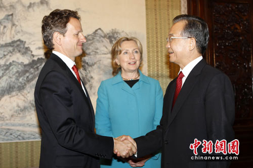 中新網(wǎng)北京5月25日電 (記者 張朔)中國總理溫家寶25日下午在中南海紫光閣會(huì)見來華出席第二輪中美戰(zhàn)略與經(jīng)濟(jì)對(duì)話的美國國務(wù)卿克林頓和財(cái)長蓋特納。