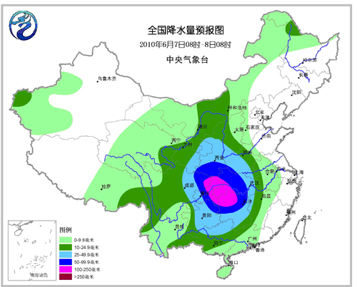 6月7日,新疆大部、西藏中部、甘肅西部、青海西部、內(nèi)蒙古大部、黑龍江大部、吉林、遼寧、河北大部、山西北部、北京、天津、山東、江蘇、上海、浙江、江西、安徽東部、福建、廣東大部為多云到晴天氣;云南西部、廣西、海南有陣性降雨;大部分地區(qū)日最高氣溫在28~33℃之間。我國其余大部分地區(qū)有小到中雨,其中甘肅中東部、陜西、四川東部、重慶、貴州大部、湖北、湖南、河南西南部等地的部分地區(qū)有大雨,部分地區(qū)有暴雨,局地有大暴雨,并伴有短時雷雨大風(圖1),日最高氣溫一般在22~28℃之間,天氣較為涼爽。