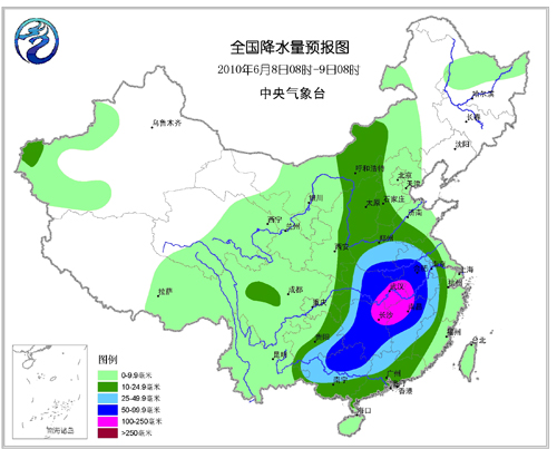 6月8日,西北地區(qū)中西部、內(nèi)蒙古西部和東部、東北大部等地為晴到多云天氣,日最高氣溫29~33℃,其中新疆盆地地區(qū)日最高氣溫可達35~37℃。我國其余大部分省(區(qū)、市)將有小到中雨,其中湖北、安徽南部、湖南、江西、浙江西部、福建西北部、廣東北部、廣西北部等地有大雨,部分地區(qū)有暴雨,湖北東南部、湖南北部、江西北部等地局地有大暴雨(圖2),并伴有短時雷雨大風等強對流天氣,大部分地區(qū)日最高氣溫在24~28℃之間。