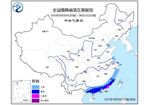 預(yù)計(jì),6月9日20時(shí)到6月10日20時(shí),江蘇東部、浙江南部、福建大部、廣東大部、廣西中南部、臺(tái)灣西北部等地有大雨,其中,福建南部、廣東中南部、廣西東南部等地有暴雨,局部有大暴雨;上述部分地區(qū)還將伴有短時(shí)雷雨大風(fēng)等強(qiáng)對(duì)流天氣。