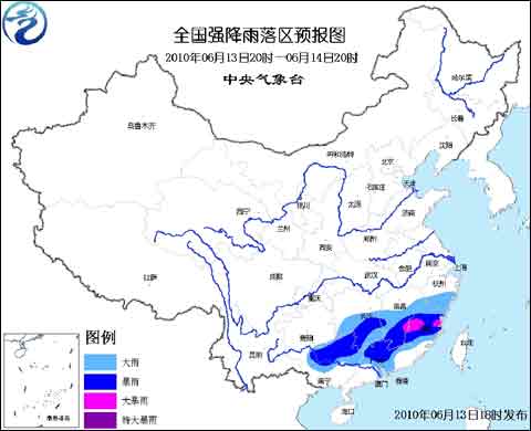 預(yù)計,6月13日20時到6月14日20時,湖南南部、江西中南部、浙江南部、福建大部、廣東北部和珠江三角洲地區(qū)、廣西中北部等地有大到暴雨,其中,江西中部偏東地區(qū)和福建中部的局部地區(qū)有大暴雨,上述部分地區(qū)并伴有短時雷雨大風(fēng)或冰雹等強(qiáng)對流天氣。