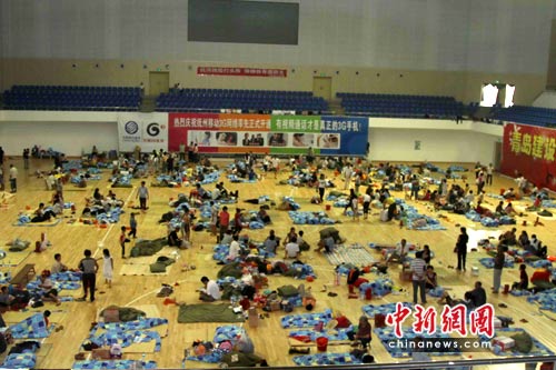 體育館內(nèi)鋪滿了被褥、涼席,有些老人和小孩還正在睡覺。有的床位已經(jīng)空出來,工作人員介紹,這些人大多轉(zhuǎn)投親友去了。記者發(fā)現(xiàn),盡管體育館內(nèi)人很多,但一點也不嘈雜,很多人就躺在被子上,靜靜地望著十幾米高的天花板。