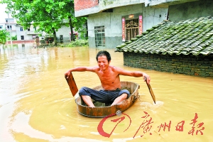 記者在羅針鎮(zhèn)上倉村見到,民房的一層已經(jīng)完全被淹沒,水位有3米多深,一些村民被困在樓房的二樓或三樓。這里離決堤的撫河唱凱堤壩大約有5公里的距離。