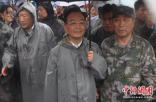 當(dāng)日上午,溫家寶冒雨深入重災(zāi)區(qū)撫州羅針鎮(zhèn),察看汛情、災(zāi)情,看望受災(zāi)群眾,慰問奮戰(zhàn)在抗洪搶險(xiǎn)一線的解放軍、武警、公安消防官兵。