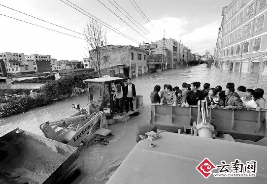 昨晚7點(diǎn)左右,孔垂柱到達(dá)馬龍縣城考察災(zāi)情,剛到老城區(qū)口,看到來(lái)來(lái)往往運(yùn)送災(zāi)民的裝載機(jī),孔垂柱立即攀上了其中一輛,拉穩(wěn)之后,站在了裝載機(jī)駕駛室外的踏板上往城內(nèi)進(jìn)發(fā)。記者也爬上這輛特殊的“視察車”,一起進(jìn)入城區(qū),目睹了馬龍老城被水淹的慘景。