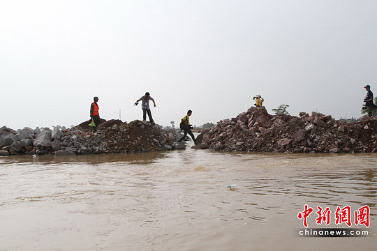 下午4點(diǎn)左右,數(shù)米長(zhǎng)的小口子,已經(jīng)被接連倒下的七八卡車(chē)石料填成數(shù)十厘米寬的“裂縫”,由于大壩堤外水位比撫河水位高,洪水從堤外往河內(nèi)倒流,剩下的最后“裂痕”就像一條涓涓細(xì)流,不少人在上面來(lái)回走動(dòng),幾天來(lái)難以跨越的決口,終于連在了一起。