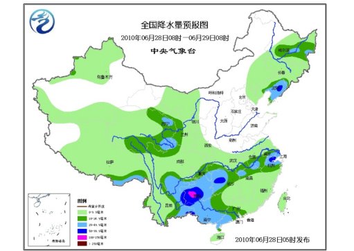 28日08時(shí)至29日08時(shí),西藏大部、青海有小到中雨或雨夾雪,新疆西北部和南部山區(qū)、甘肅大部、寧夏、陜西南部、內(nèi)蒙古西部偏西地區(qū)和東南部、東北地區(qū)大部、河北東北部、江淮、江漢、江南、華南大部以及西南地區(qū)有小到中雨或陣雨,其中,西藏東南部、青海東部、甘肅西南部、黑龍江中部偏東地區(qū)、遼寧中東部、川西高原南部、云南東部、貴州大部、重慶東南部、湖南西部、廣西西部和南部、廣東西南部、江西北部、蘇皖南部、上海、浙江北部等地的部分地區(qū)有大雨、局地暴雨,貴州西部的局部地區(qū)有大暴雨;上述部分地區(qū)并伴有短時(shí)雷雨大風(fēng)等強(qiáng)對(duì)流天氣。新疆西部和北部、甘肅西部、內(nèi)蒙古中東部等地有4~6級(jí)風(fēng),其中,新疆山口地區(qū)風(fēng)力可達(dá)8~9級(jí)。東海大部海域有5~6級(jí)西南風(fēng)。