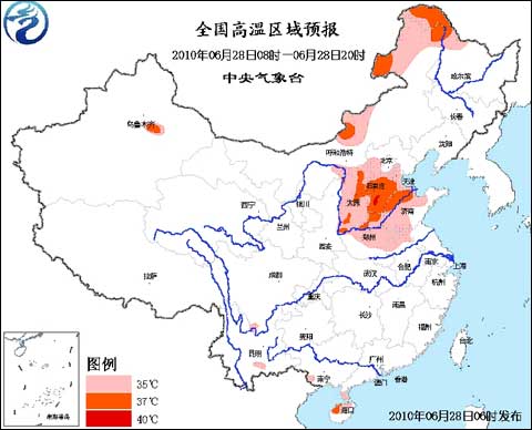 中新網(wǎng)6月28日電 中央氣象臺2010年6月28日06時繼續(xù)發(fā)布高溫藍色預(yù)警:預(yù)計,今天白天,內(nèi)蒙古東北部和中部的部分地區(qū)、黑龍江西北部、山西、河北大部、天津、河南中北部、山東中西部、安徽北部、江蘇西北部、廣東雷州半島、海南北部等地有35~37℃、局地38℃的高溫天氣,其中,河北南部的局部地區(qū)最高氣溫可達40℃。