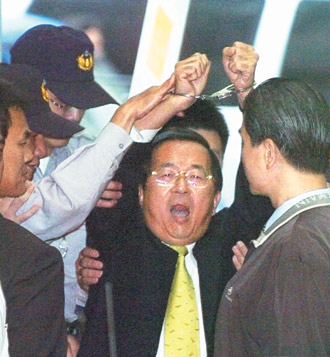 陳水扁應(yīng)訊后步出特偵組,臉上雖有疲色,但跟云林縣長(zhǎng)蘇治芬一樣高舉戴著手銬的雙手,高喊“政治迫害”、“司法冤獄”、“臺(tái)灣加油”,隨即由特偵組法警戒護(hù)移送臺(tái)北地院。