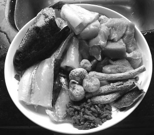 制法:將生魚洗凈,放入鍋用油煎約7分鐘,再洗干凈備用。將豬肉放入瓦罐用開水焯約5分鐘。