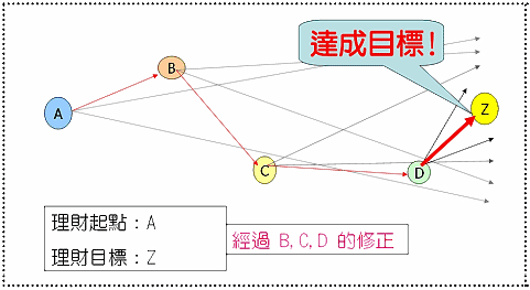 經(jīng)過一段時(shí)間,理財(cái)階段來到了C點(diǎn),似乎又偏離了當(dāng)初既定的方向。就又是“適時(shí)調(diào)整”的時(shí)候,所以重新找出新方向,即從C點(diǎn)至Z點(diǎn)的雙箭頭所涵蓋的范圍。在投資理財(cái)?shù)倪^程中,會(huì)不斷的重復(fù)B點(diǎn)、C點(diǎn)、D點(diǎn)等的修訂調(diào)整。
