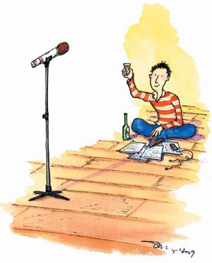 我深呼吸了一下,故作鎮(zhèn)定出場,還不時面露快要僵掉了的微笑,以顯出大將之風。使出一百二十分的濃情,努力回想電影《藍宇》中的感人情節(jié),賣力演唱《你怎么舍得我難過》。曾看過歌星蔡依林或周杰倫在演唱會時,神色自若走來走去,與臺下觀眾互動。我自以為對歌詞已了如指掌,越唱越來勁,便也依樣畫葫蘆離開有歌詞的小熒光幕,邊走邊唱學大歌星模樣,顧盼生姿。