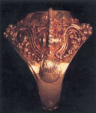 例如附圖的印度黃金指環(huán),工藝甚精美,浮雕圖案富有民族風(fēng)格,獨特典麗,就是十九世紀(jì)初期的代表作。其實,我國晉代時也有鏨刻典麗花紋的金指環(huán),當(dāng)然風(fēng)格大相徑庭,但更如鳳毛麟角。