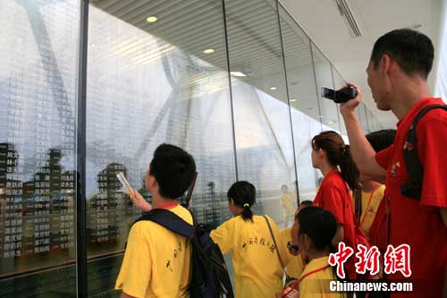 27日下午,參加“2010年海外華裔及港澳臺(tái)地區(qū)青少年‘中國(guó)尋根之旅’夏令營(yíng)”的6000余名華裔青少年一同參觀了“鳥(niǎo)巢”和“水立方”。他們中很多營(yíng)員的父母或親朋好友曾為“水立方”的建設(shè)捐款,姓名被刻在“水立方”的留名廊上。