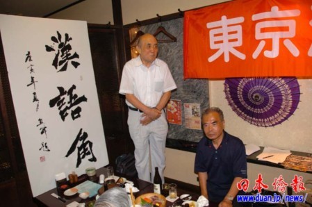 交流會上展示了旅日華人書法家熊峰和日本書法家冢越誠分別題寫的“漢語角”,受到大家的好評。