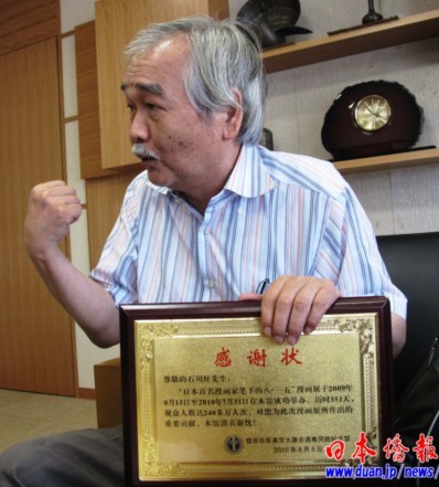 中新網(wǎng)9月2日電 據(jù)《日本僑報(bào)》報(bào)道,著名日中友好人士、前日中友好二十一世紀(jì)委員會(huì)日本委員石川好,日前收到侵華日軍南京大屠殺遇難同胞紀(jì)念館寄來(lái)的感謝狀,感謝石川好和日本漫畫家在該館成功舉辦“日本百名漫畫家筆下的8·15”展覽的事跡。