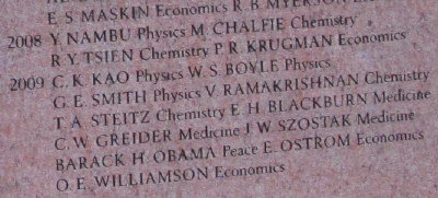 此次新刻上的11個名字是2009年諾貝爾獎的得主,其中包括高錕和George E. Smith等三位物理獎得主、Thomas A. Steitz等兩位化學獎得主、Jack W. Szostak等三位醫(yī)藥類獎得主、Oliver E. Williamson等兩位經濟獎得主和獲得和平獎的美國總統(tǒng)奧巴馬的名字。