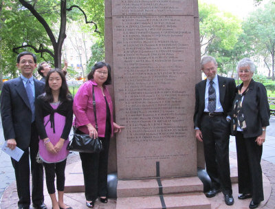 中新網9月29日電 據(jù)美國《世界日報》報道,2009年美國11位諾貝爾獎得主的名字28日新添在紐約曼哈頓上西城羅斯福公園(Theodore Roosevelt Park)內的諾貝爾紀念碑(Nobel Monument)上,其中包括華裔物理獎得主高錕(Charles Kuen Kao)的英文名字C.K.Kao。高錕的三位家人出席了新聞發(fā)布會,代高錕分享這一殊榮。