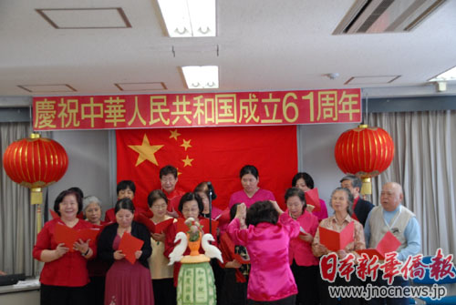 東京各界華僑和應(yīng)邀前來(lái)參加活動(dòng)的日中友好會(huì)館、在日朝鮮人總聯(lián)合會(huì)、在日大韓民國(guó)民團(tuán)、日本新華僑華人會(huì)、在日中國(guó)企業(yè)協(xié)會(huì)、日本中華總商會(huì)、橫浜華僑總會(huì)、長(zhǎng)野華僑總會(huì)等團(tuán)體在中華人民共和國(guó)61年國(guó)慶前夕齊聚一堂,華人華僑的愛(ài)國(guó)思鄉(xiāng)之情涌上心頭。席間,東京華僑婦女會(huì)會(huì)長(zhǎng)吳少煖帶領(lǐng)婦女會(huì)員們?yōu)榇髸?huì)獻(xiàn)唱一曲《五星紅旗》,不僅抒發(fā)了大家思念之情,更激發(fā)了眾人的愛(ài)國(guó)激情。吳少煖包含激情地表示:“我們獨(dú)在異鄉(xiāng)為異客,每逢佳節(jié)倍思親。雖然身在異鄉(xiāng),但是思念祖國(guó)的心是一直沒(méi)有改變過(guò)的。望祖國(guó)今后更加繁榮富強(qiáng)!