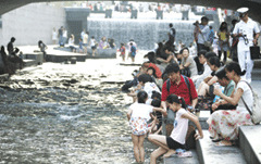 王某一家人從免稅店出來(lái)走向清溪川。清溪川是在中國(guó)也很有名的旅游景點(diǎn)。雖然是晚間時(shí)分,但天氣依然炎熱。王某的兩個(gè)兒子跳入水中。稍后而來(lái)的其他游客也脫掉鞋子進(jìn)入水中。一位游客說:“很涼快,很舒服。孩子們也很喜歡。在城市中心建設(shè)小溪,感到很羨慕!