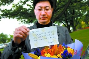 陳先生還特意買(mǎi)了兩束鮮花,其中一束粉紅色的玫瑰是他補(bǔ)送的情人節(jié)鮮花,他在寫(xiě)給妻子的留言中說(shuō):“這次你要永遠(yuǎn)留著,不要再扔垃圾桶了!