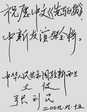值此建國60周年之際,謹(jǐn)借《中文先驅(qū)報》之一隅,向大家的愛國愛鄉(xiāng)情懷深表贊賞和感謝,祝愿各位在事業(yè)上取得更大成績,為中新友好做出新的貢獻(xiàn)。