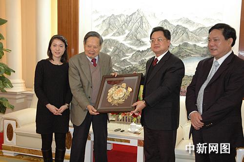 中新社汕頭十二月二十日電 (李怡青 陳妍)著名美籍華裔科學家楊振寧受廣東潮州市委市政府邀請到潮州講學。二十日下午,廣東潮州市委書記駱文智在潮州迎賓館會見了楊振寧及其夫人翁帆女士。潮州是翁帆女士的故鄉(xiāng),這也是楊氏伉儷婚后第一次回到潮州。