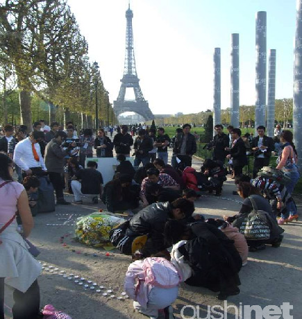 數(shù)百名在法留學(xué)生和華人于18日在巴黎艾爾菲鐵塔前的和平墻點起蠟燭,為青海玉樹地震的遇難者祈福。他們將數(shù)百支蠟燭擺成巨大的心形和“玉樹”字樣,然后逐一將蠟燭點燃,與此同時,祈福板上也留下他們各式的祝福語,表達(dá)自己對災(zāi)區(qū)同胞們血脈相連的感情。望著燃燒的蠟燭,留學(xué)生和華人高呼“玉樹加油”,衷心的祈求青海玉樹地震中的生者平安,死者安息;顒游簧俾愤^的法國人和游人也停下腳步,為玉樹地震的死難者哀悼。