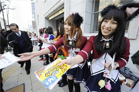據(jù)報(bào)道,“女仆們”聚集在以“御宅街”聞名的大阪日本橋上,這樣做的目的是要鼓勵(lì)因經(jīng)濟(jì)不景氣而易陷入消沉的上班族。來(lái)來(lái)往往的行人看到這番不同于往常的景象都感到吃驚,但也有人面露羞澀的微笑或是拿出照相機(jī)留念。