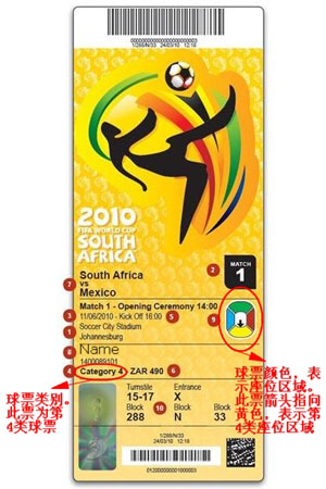 需要特別提醒的是,外國球迷僅可持前3類球票進(jìn)場觀賽。第4類球票僅限南非公民持身份證使用,外國球迷使用此類球票無法入場(見例圖)。殘疾人專用球票僅限殘疾人觀賽使用。