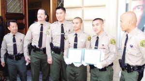 畢業(yè)后被分配到洛杉磯雙塔監(jiān)獄工作的陳得光,7歲的時候跟隨父母從香港移民美國,并在柔似密安家落戶。從小就想當警察的他06年報名加州大學爾灣分校,專修犯罪心理學,畢業(yè)后又在今春報名參加了洛縣警局警察培訓學校,經(jīng)過19周的緊張訓練,終于在今天的畢業(yè)典禮上穿上了夢寐已久的警服。