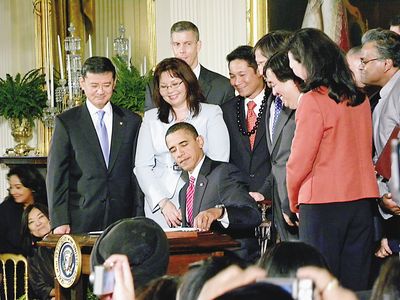14日參與簽署行政命令儀式的還有國(guó)會(huì)眾議員吳振偉、本田、高光映、國(guó)內(nèi)安全部法律總顧問方富宇(Ivan K. Fong)、勞工部婦女局美中區(qū)主任、“全美亞太裔支持奧巴馬領(lǐng)袖委員會(huì)”共同主席張秀賢,以及奧巴馬的妹婿吳加儒等。