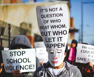 中新網(wǎng)1月8日電 美國(guó)南費(fèi)城高中上個(gè)月初發(fā)生的非洲裔學(xué)生集體攻擊亞裔學(xué)生的事件,造成了26名學(xué)生受傷、其中7人須送醫(yī)治療,這引起各界關(guān)注,同時(shí)也使種族問(wèn)題再被提及。據(jù)美國(guó)《華盛頓觀察》7日?qǐng)?bào)道,此次校園暴力事件,學(xué)生抨擊是學(xué)校長(zhǎng)期忽視校園種族沖突所致,因而罷課表達(dá)不滿(mǎn)。教育專(zhuān)家認(rèn)為,學(xué)校和社會(huì)都應(yīng)該更坦誠(chéng)地談?wù)摲N族問(wèn)題,才能使青少年有正確的態(tài)度。