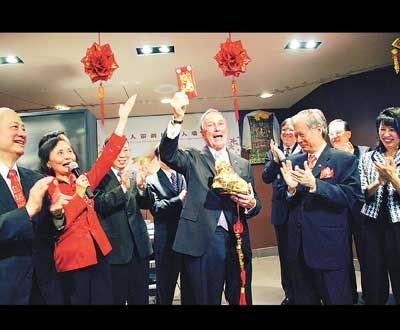 中新網(wǎng)2月25日電 據(jù)美國《僑報》報道,紐約市長彭博23日來到華策會人瑞中心,向華裔耆老拜年。人瑞中心主任伍寶玲按華人過年傳統(tǒng)給彭博送上仿真金馬、金虎和紅包,彭博喜笑顏開,開心地摸著虎頭,希望給紐約帶來好運。