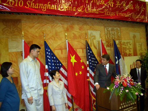 佩里州長非常高興能在中國駐休斯頓總領事館與高總領事舉行聯合招待會。他向大家介紹,德州與中國有非常密切的旅游、文體交流、經濟合作和科技協作關系。在場的姚明就是一個例證。他邀請姚明夫婦來到主席臺前,見證中國-得州的友好關系。上海世博會期間,將有一周的德州專題展覽,他本人熱切期待著不久的將來訪問世博會、訪問上海、訪問中國。