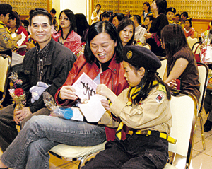 與丈夫史文山在教國際標準舞的沈柏容,在看到9歲的女兒史洛謙,送了張印有一個大大“孝”字的卡片和一大花束康乃馨時,笑得合不攏嘴。佛光童軍小兄妹譚明駿和譚明麗,也各送了張“孝”卡給媽媽王淑芬。王淑芬說,能在佛光山收到子女的愛心卡和康乃馨,很有意義。