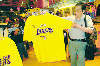 自夏威夷前往洛杉磯看望兒子的華先生和太太正在挑選湖人隊胸章,華先生表示,胸章較便宜,容易攜帶,盡量多買些送給夏威夷的鄰居朋友。而華太太則為兒子、孫女挑選湖人隊T恤衫、帽子。華先生說,估計花費近200元購買各種湖人紀(jì)念品。