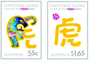 中新網(wǎng)1月13日電 據(jù)澳洲《星島日?qǐng)?bào)》報(bào)道,為紀(jì)念2010農(nóng)歷新年虎年的來(lái)臨,澳洲郵局特別推出一套由墨爾本設(shè)計(jì)師潘德妮設(shè)計(jì)的別致虎年郵票。
